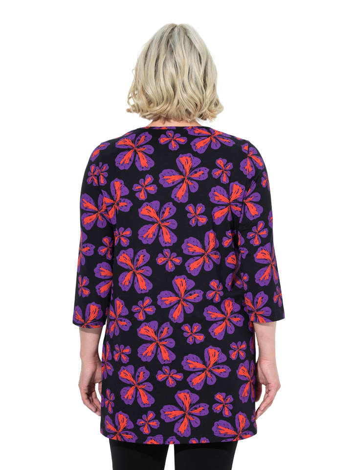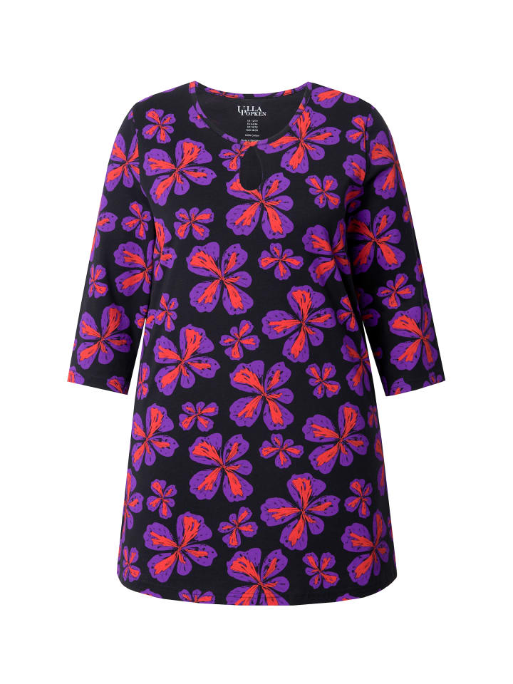 Рубашка А-силуэта с длинными рукавами и цветочным узором. Круглый вырез горловины с небольшим вырезом, рукава 3/4. Удобный широкий подол с боковыми разрезами.