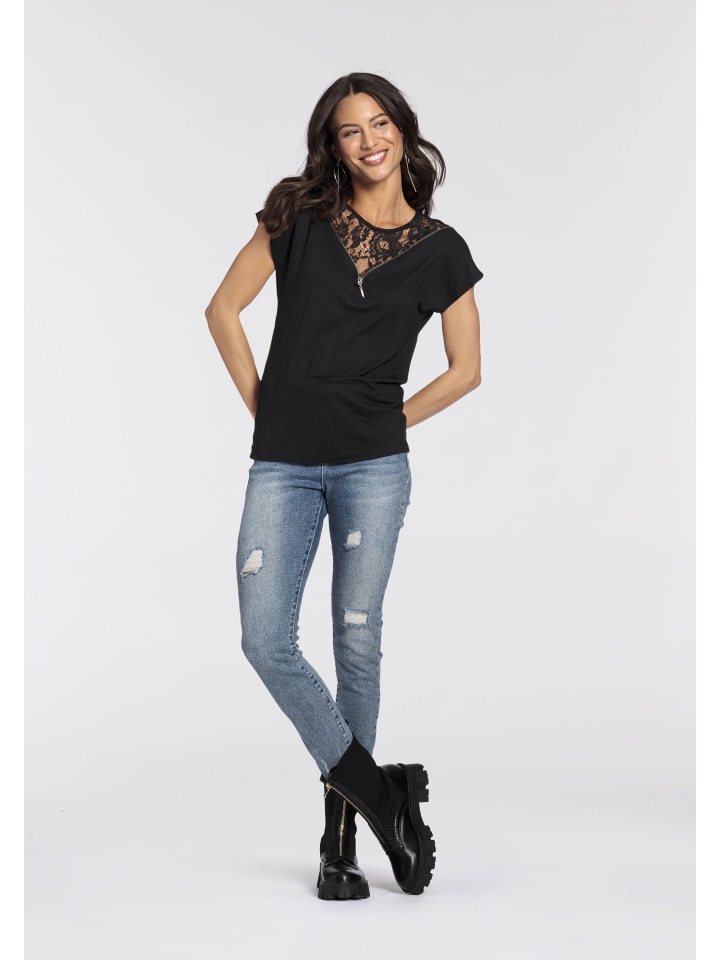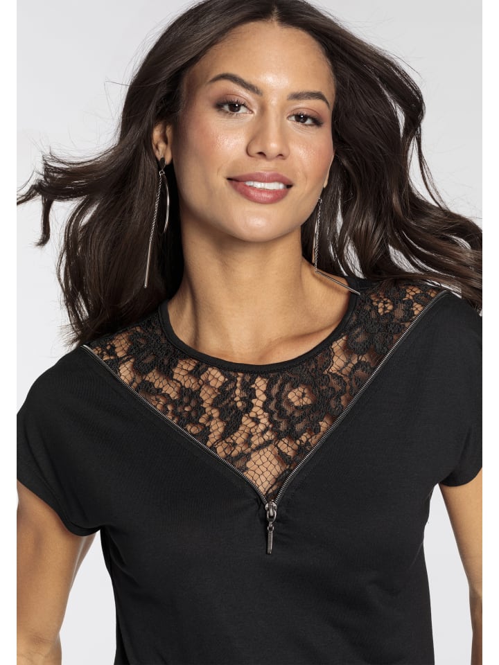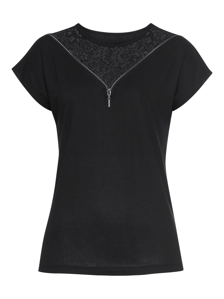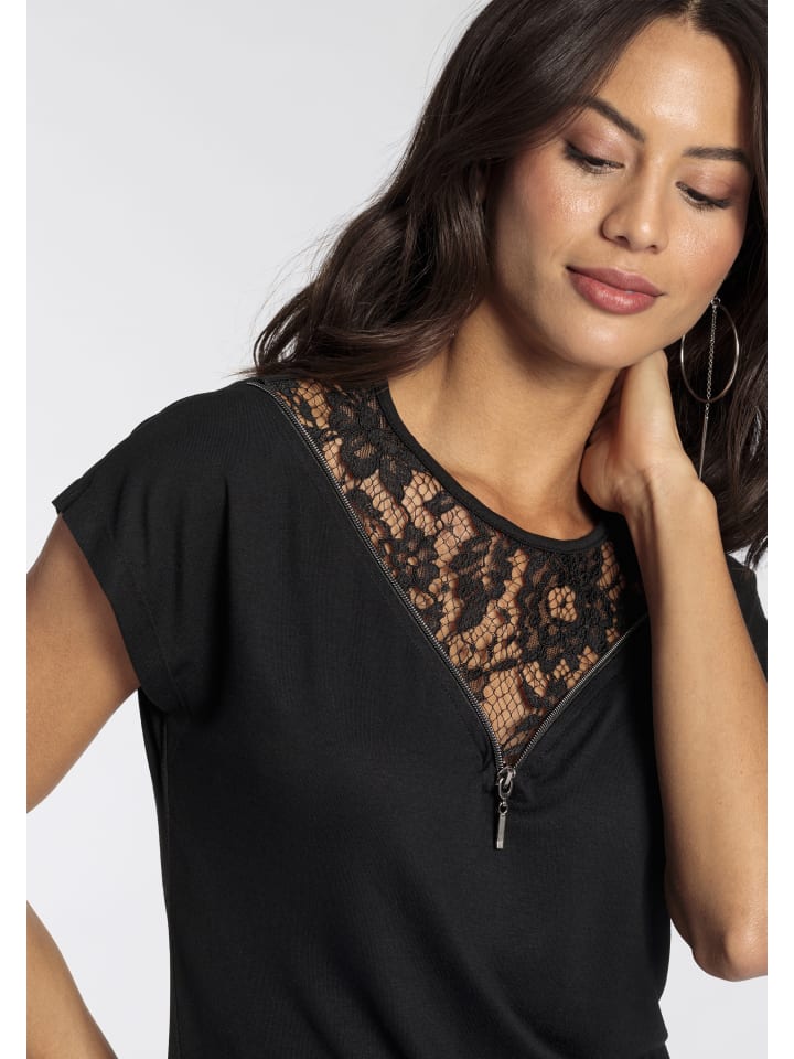 Универсальный женский топ с короткими рукавами от Melrose с кружевной отделкой. Удобный крой до бедер идеально подходит для создания как уютных, так и стильных образов. Красивая кружевная ткань придает топу особый праздничный вид.