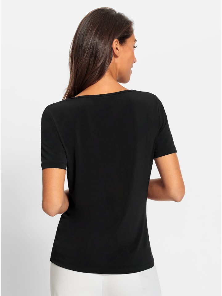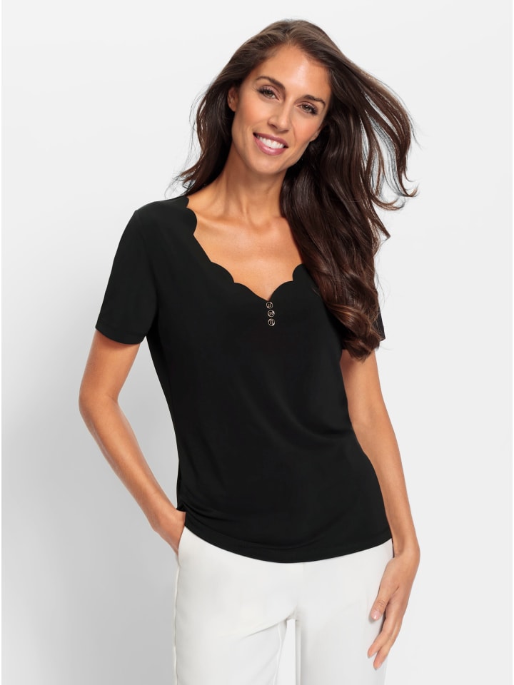 Высококачественная футболка с V-образным вырезом, волнистым краем, вырезанным лазером, и декоративными пуговицами. Короткие рукава.