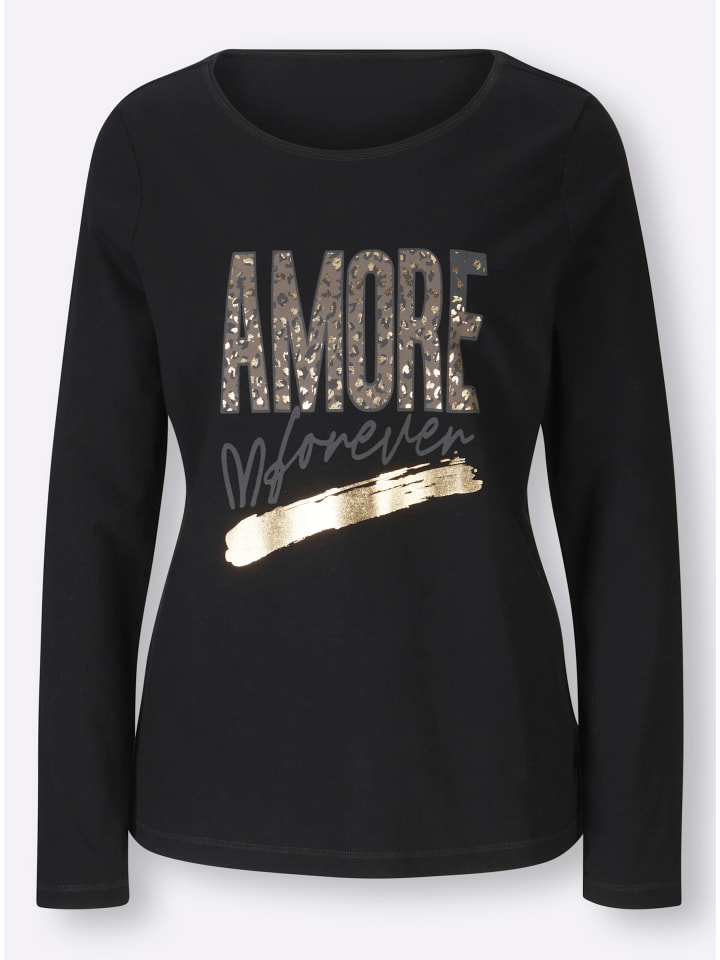 Стильная привлекающая внимание рубашка с фольгированным принтом спереди, включающим слова AMORE и FOREVER. Высочайшее качество трикотажа. Поддерживает инициативу «Хлопок, сделанный в Африке».