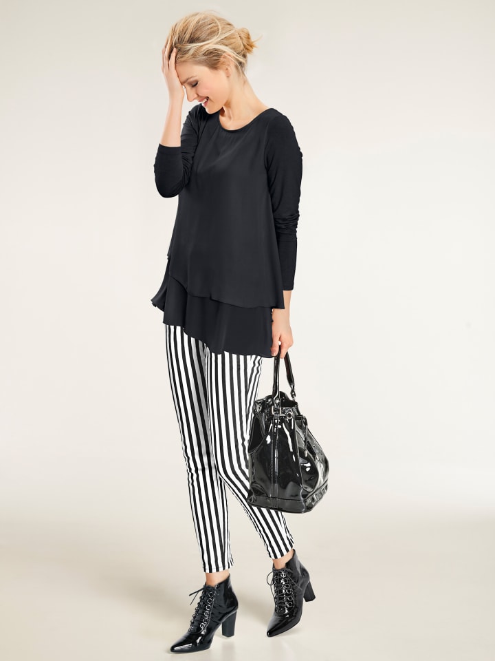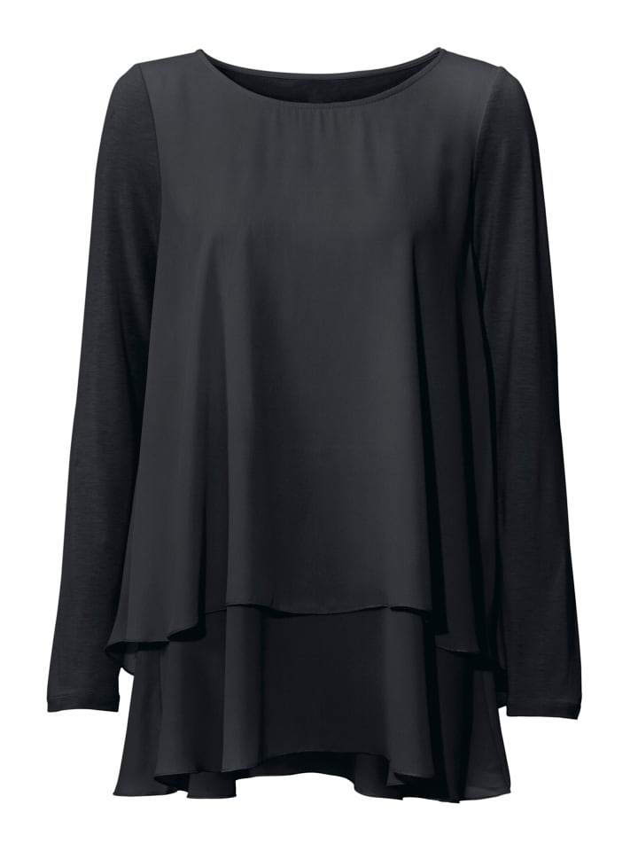 Рубашка с круглым вырезом. Эффектный многослойный дизайн. Нежный, прозрачный шифон. Облегающий крой с длинными рукавами. Высококачественный комбинированный материал.