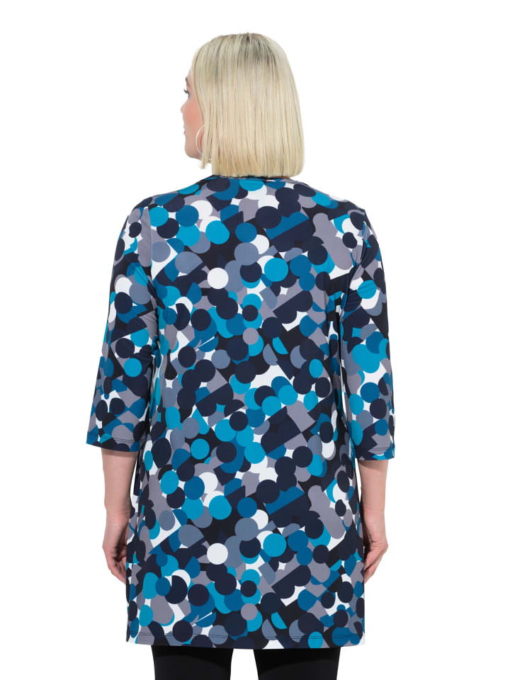 Рубашка А-силуэта с длинными рукавами из легкого в уходе трикотажа в горошек. V-образный вырез, рукава 3/4. Удобный широкий подол.