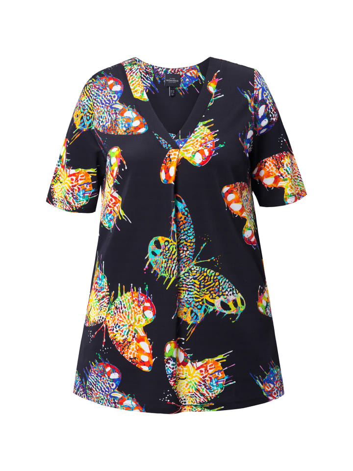 Облегающая рубашка А-силуэта из элегантной обтягивающей пике с тонкой текстурой и узором в виде бабочек. V-образный вырез с декоративной складкой, короткие рукава. Боковые разрезы для дополнительного комфорта.