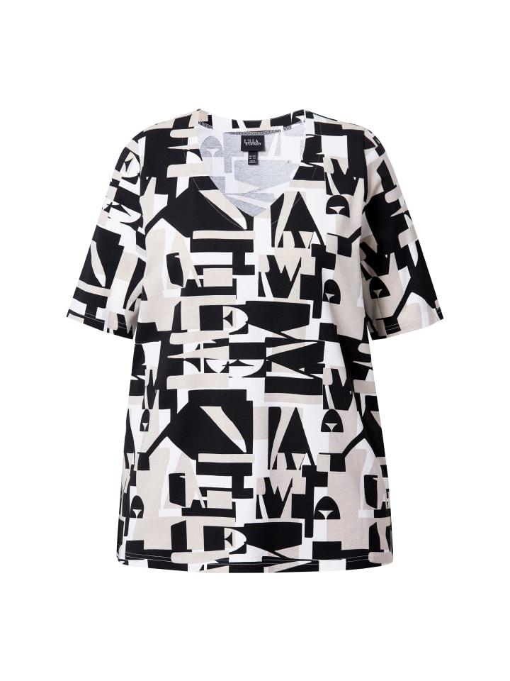 Футболка А-силуэта из мягкого трикотажа с графическим рисунком в виде букв. V-образный вырез, короткие рукава, боковые разрезы для дополнительного комфорта.