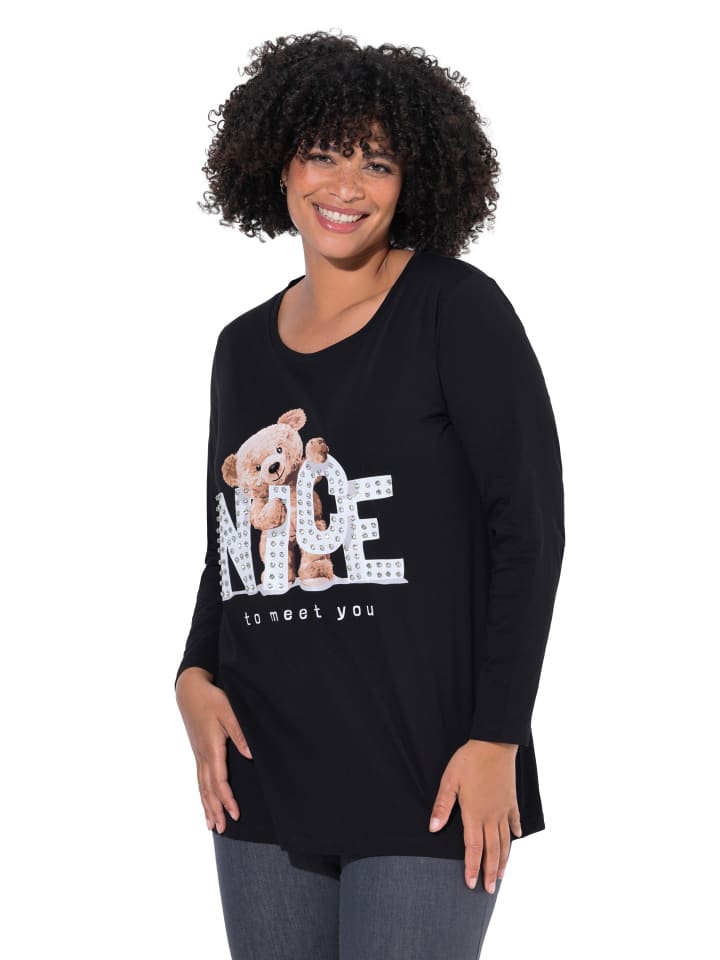 Футболка классического кроя из мягкого трикотажа с изображением плюшевого мишки и стразами на надписи. Круглый вырез горловины, длинные рукава.