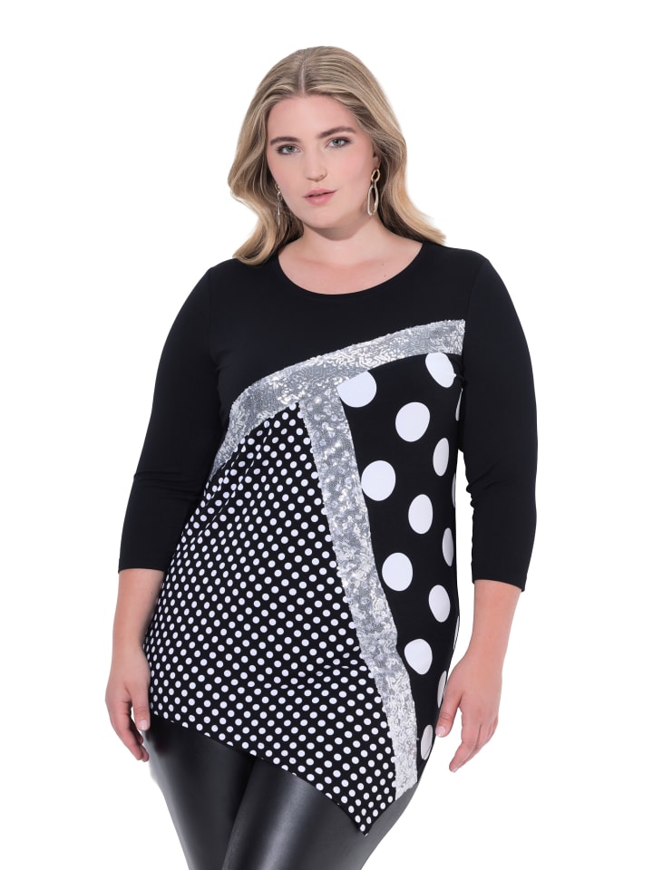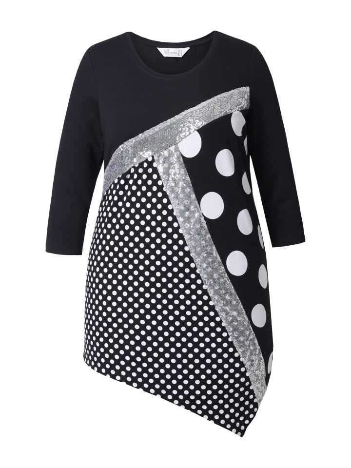 Футболка классического кроя из мягкого трикотажа с декоративными стразами, асимметричным рисунком и отделкой пайетками. Круглый вырез, рукава 3/4, заостренный низ.