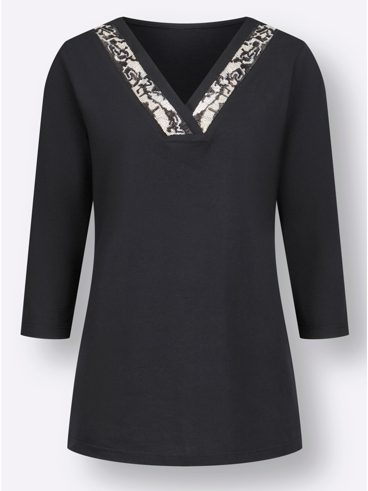 Красивая деталь этой рубашки с рукавами 3/4 - украшение из пайеток на перекрывающемся V-образном вырезе.