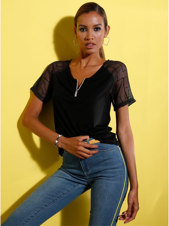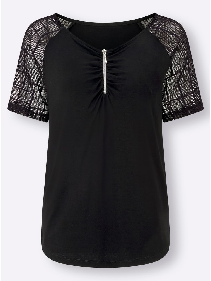 Рубашка с современным графичным кружевом на плечах и короткими рукавами. V-образный вырез переходит в молнию с привлекательными сборками. Красиво закругленный подол.