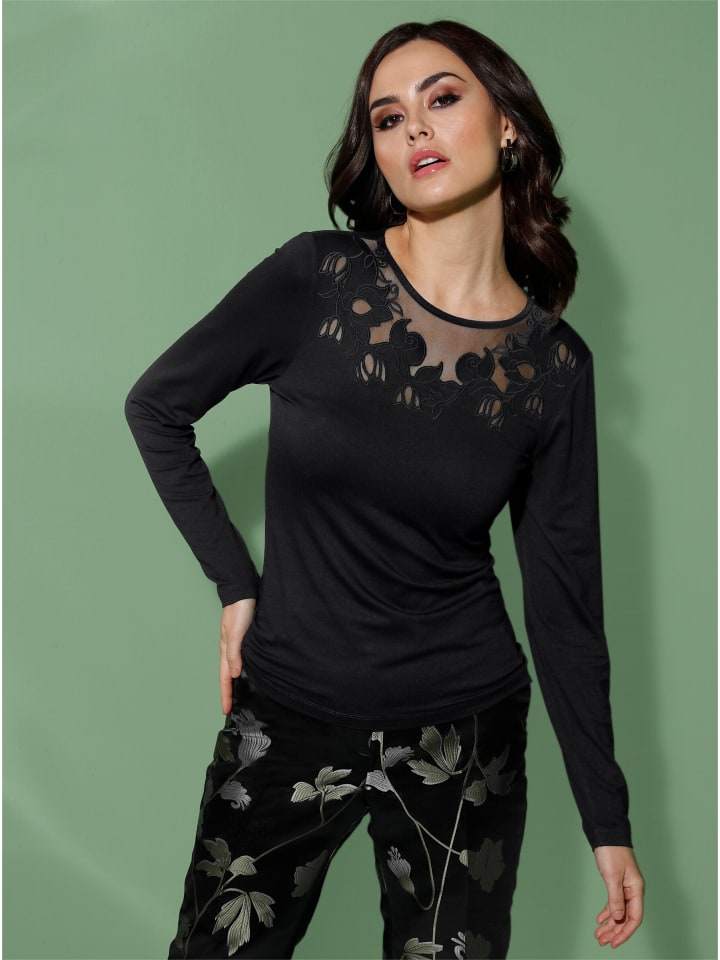 Комплименты гарантированы! Эта рубашка очаровывает своей тонкой прозрачной вставкой из тюля с цветочной аппликацией на круглом вырезе и мягкой, эластичной вискозной тканью. Длинные рукава.