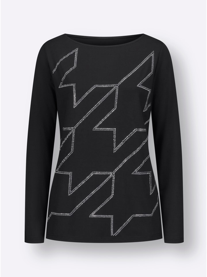 Классический: крупный узор «гусиная лапка» со сверкающими стразами. Удобный: однотонный трикотаж. Рубашка с вырезом-лодочкой и длинными рукавами.