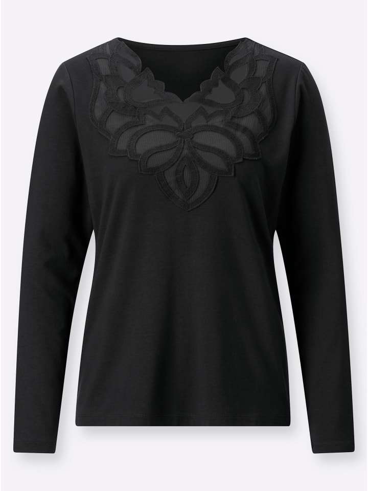 Эта рубашка из модала и хлопка гарантированно вызовет комплименты! Тонкая прозрачная сетчатая вставка на визуально удлиняющем V-образном вырезе украшена изысканной вышивкой в тон. Длинные рукава и невероятно мягкая смесовая ткань.