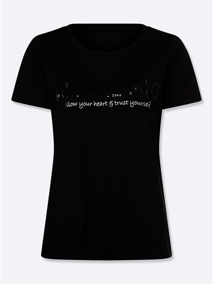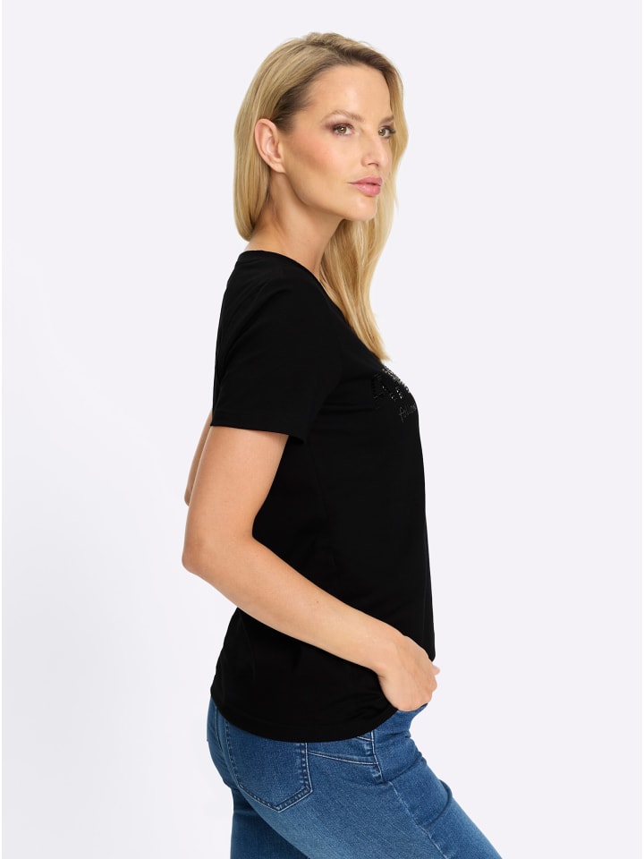 Современная футболка с мерцающим логотипом и декоративными стразами спереди. Круглый вырез горловины и короткие рукава. Сертифицировано GOTS.