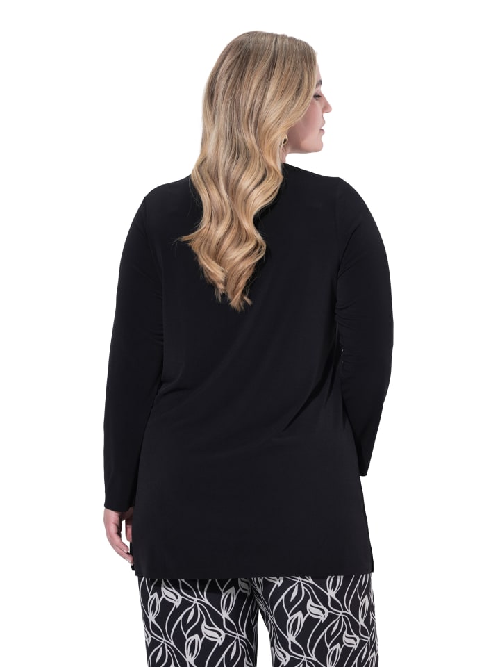 Длинная рубашка, слегка удлиненный А-силуэт, из очень гладкого трикотажа. V-образный вырез, длинные рукава. Боковые разрезы для дополнительного комфорта.