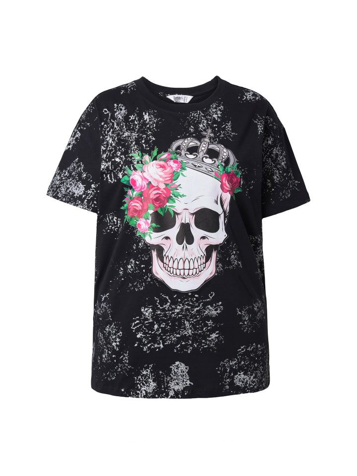 Футболка свободного кроя с рисунком черепа. Круглый вырез горловины, спущенная линия плеча, короткие рукава.