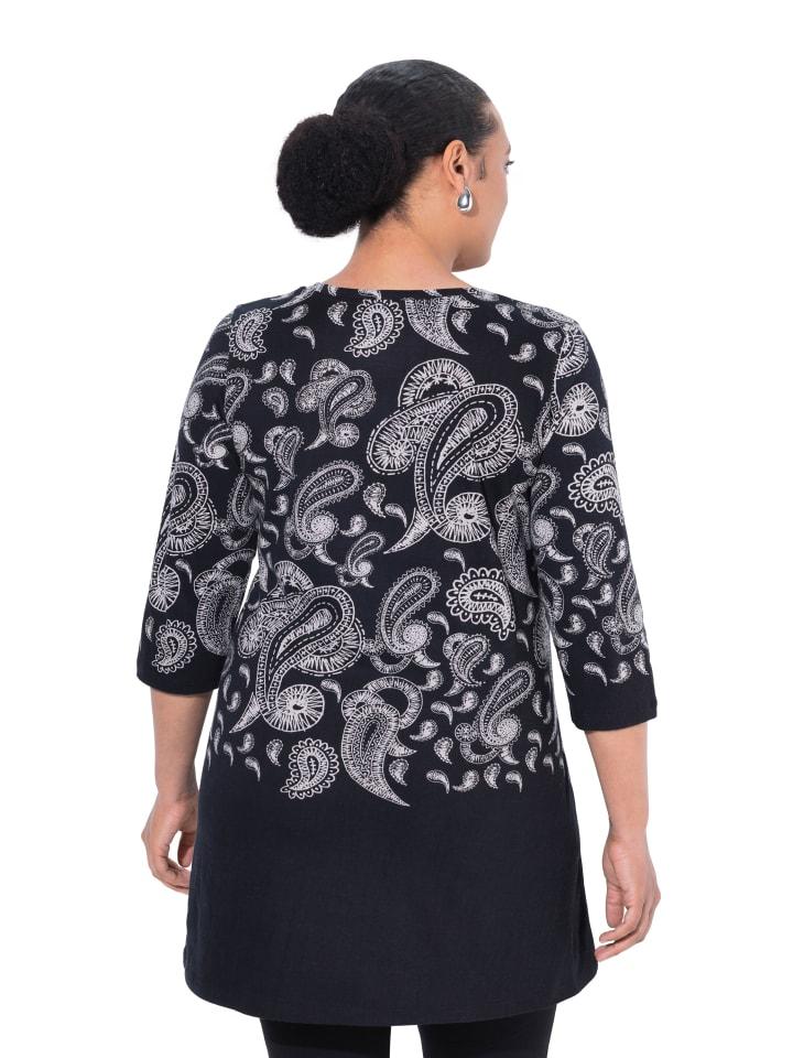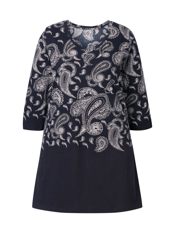 Рубашка А-силуэта с длинными рукавами из мягкого, очень гладкого трикотажа с декоративным принтом. V-образный вырез, рукава 3/4. Удобный широкий подол.