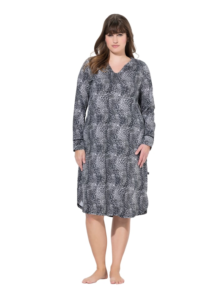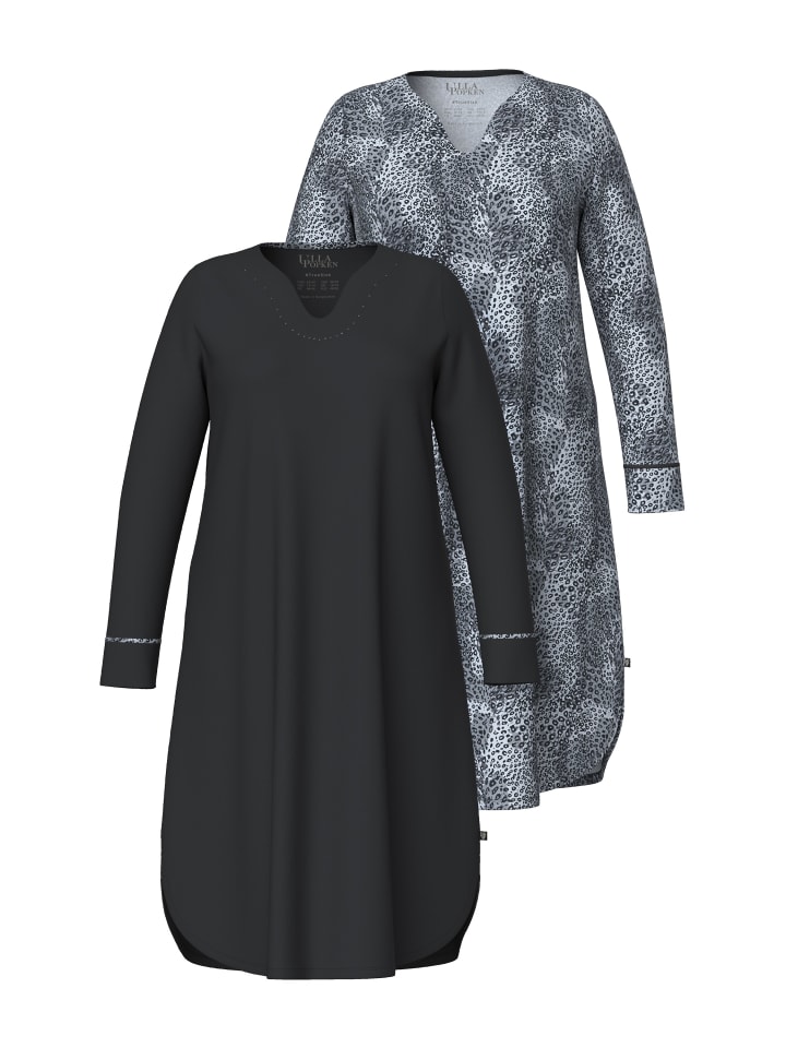 Футболки oversize в упаковке по 2 шт. Одна с принтом по всей поверхности, другая однотонная. У каждой футболки туникообразный вырез, длинные рукава с декоративной окантовкой и закругленный подол.