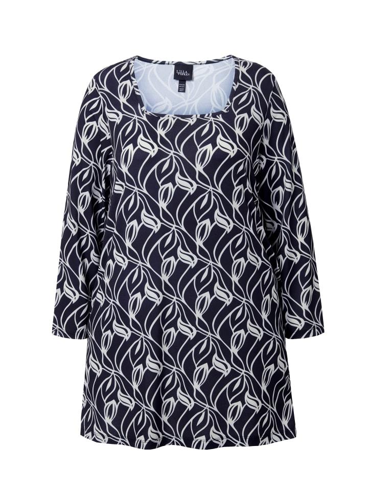 Длинная рубашка, слегка удлиненный А-силуэт, из очень гладкого узорчатого трикотажа. Квадратный вырез, длинные рукава. Комфортная ширина подола.