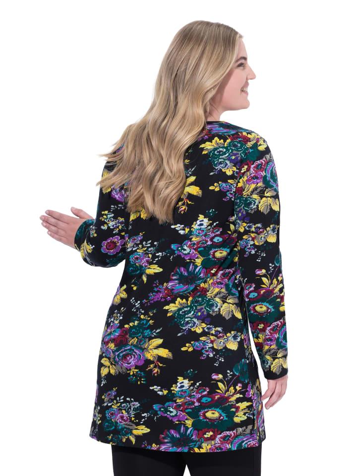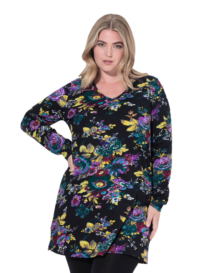 Рубашка А-силуэта с длинными рукавами из чистого хлопка с цветочным узором. V-образный вырез, длинные рукава. Свободный подол с боковыми разрезами для дополнительного комфорта.