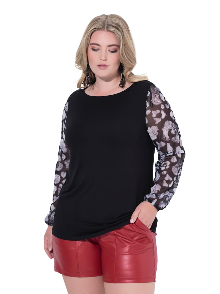 Футболка классического кроя из приятного к телу трикотажа с вырезом «лодочка». Длинные рукава из прозрачной сетки с рисунком и эластичными манжетами. (90% полиэстер, 10% эластан).