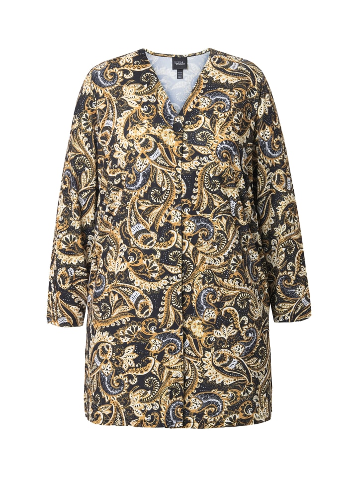 Трикотажная куртка, слегка удлиненного А-силуэта, из очень гладкого трикотажа с узором пейсли. Застежка на пуговицы под V-образным вырезом, длинные рукава. Длинные боковые разрезы для дополнительного комфорта.