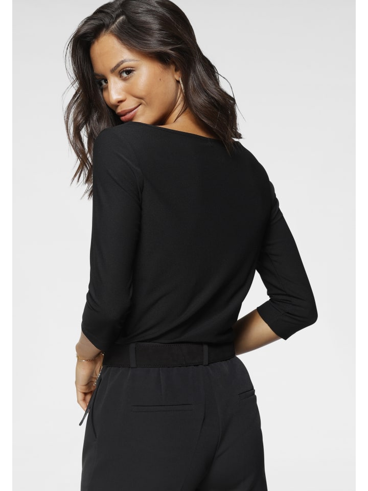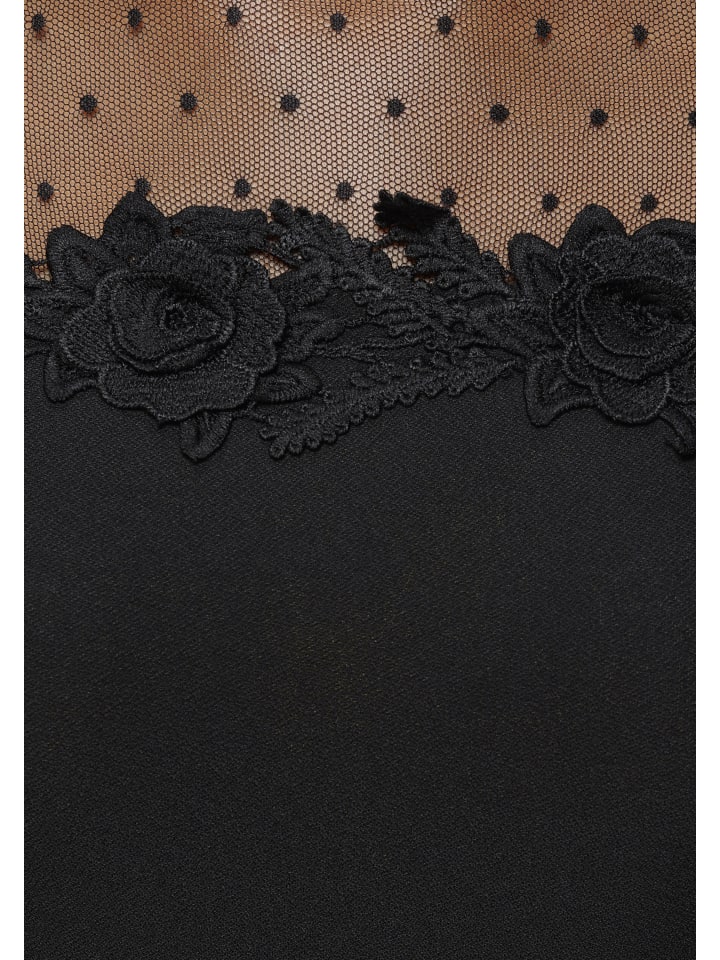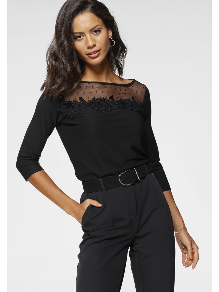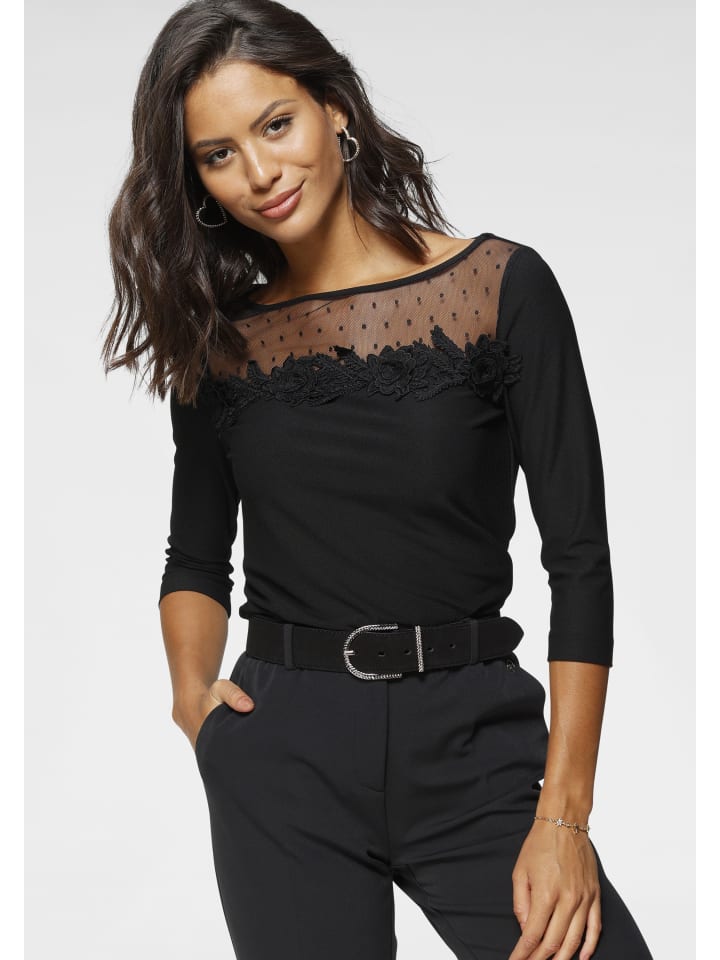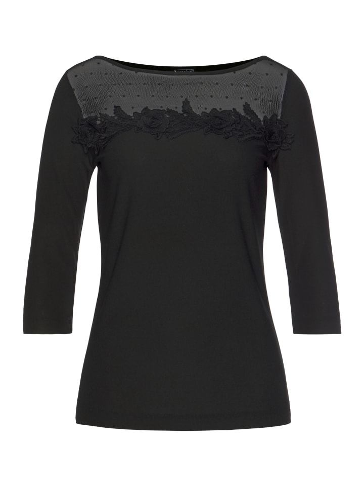 Универсальный женский топ с круглым вырезом от Laura Scott. Он имеет приталенный крой до бедер и рукава три четверти. Верх украшен игривыми и очаровательными цветочными аппликациями, которые благодаря красивому кружеву создают особенно праздничный вид.