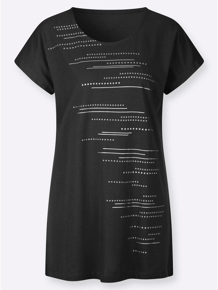 Эта удлиненная рубашка соблазнительно мерцает и сверкает! Эта удлиненная рубашка подчеркивает фигуру эффектным сочетанием фольги и блесток спереди. Она имеет привлекательный А-силуэт со спущенными плечами. Изготовлена из удивительно мягкого смешанного материала.