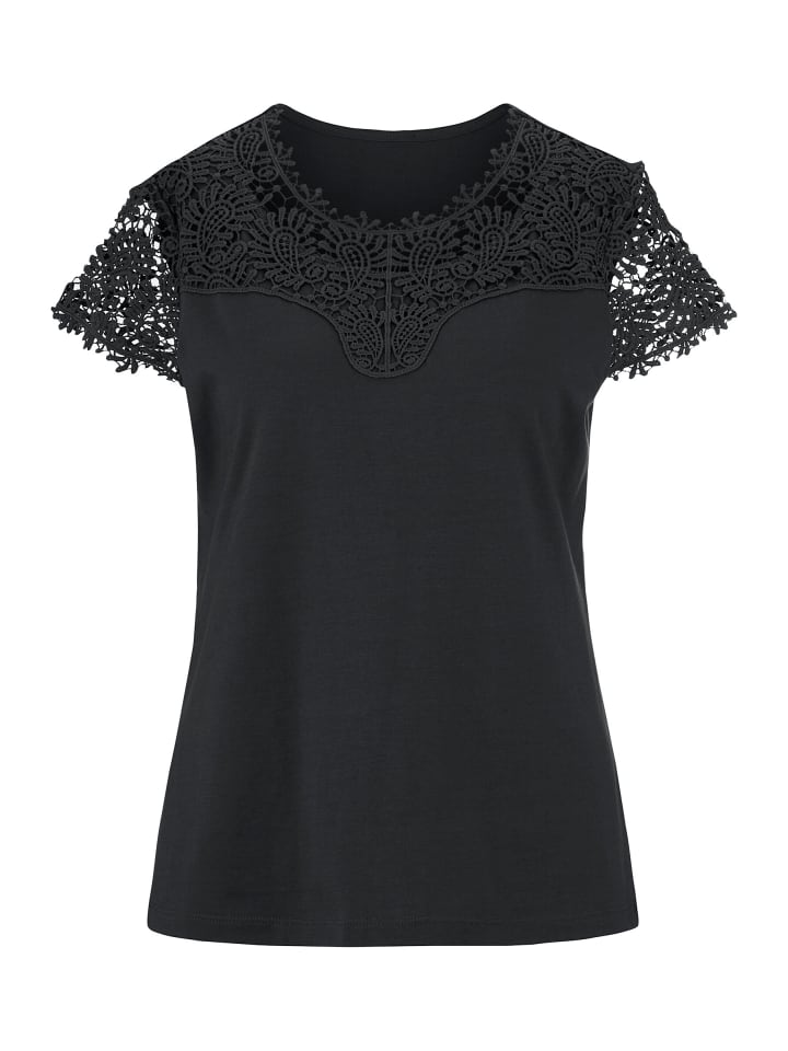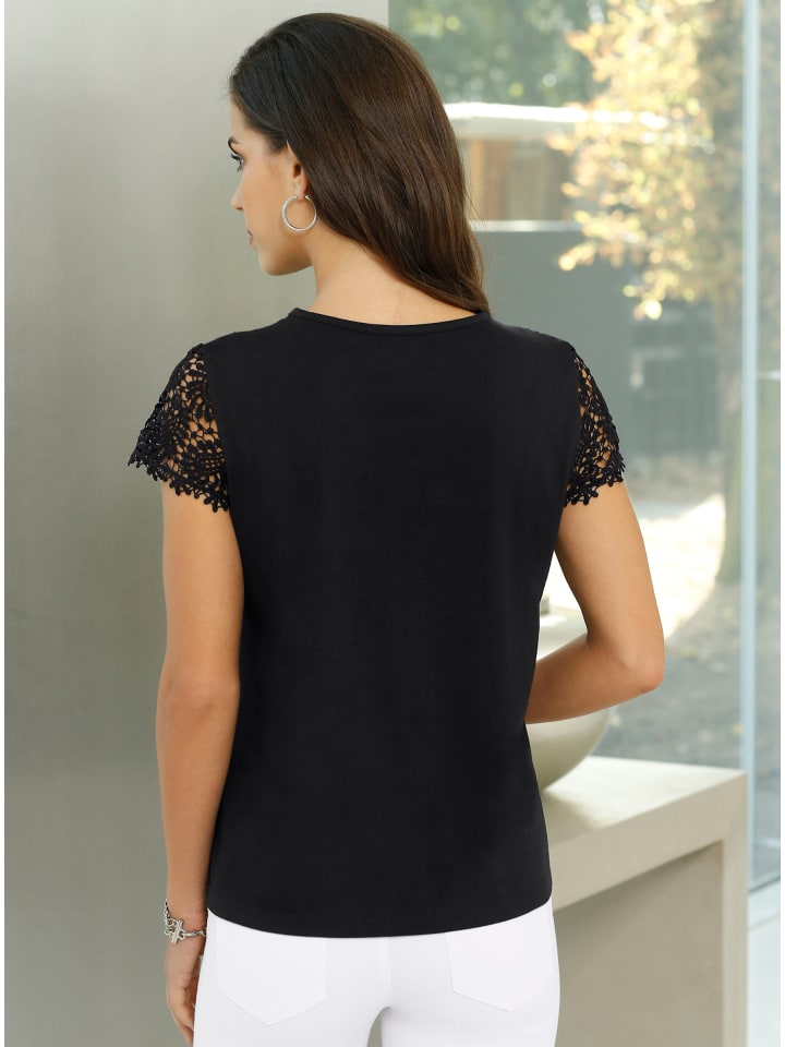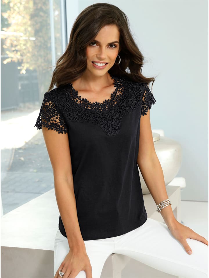 Эта рубашка украшена элегантным кружевом, прозрачным на рукавах и вырезе, но непрозрачным на бретельках, чтобы не было видно бретельки бюстгальтера. Рубашка изготовлена из очень мягкой и приятной на ощупь пряжи с добавлением модала.