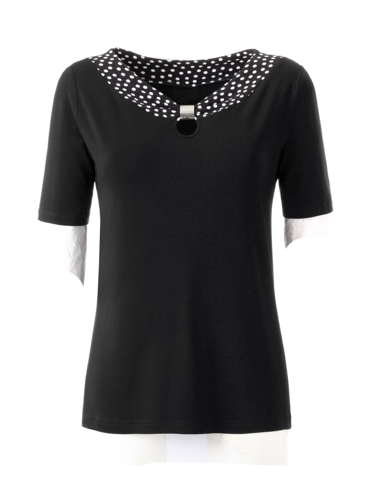 Широкая отделка в горошек на горловине добавляет стильный штрих этой рубашке. Спереди она украшена декоративной застежкой. Короткие рукава.