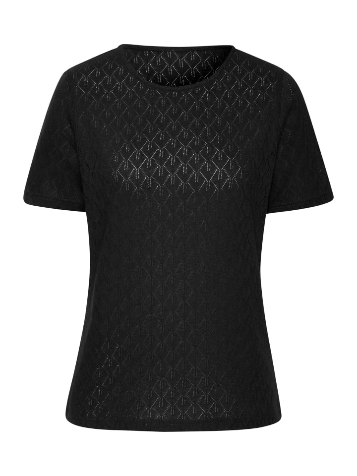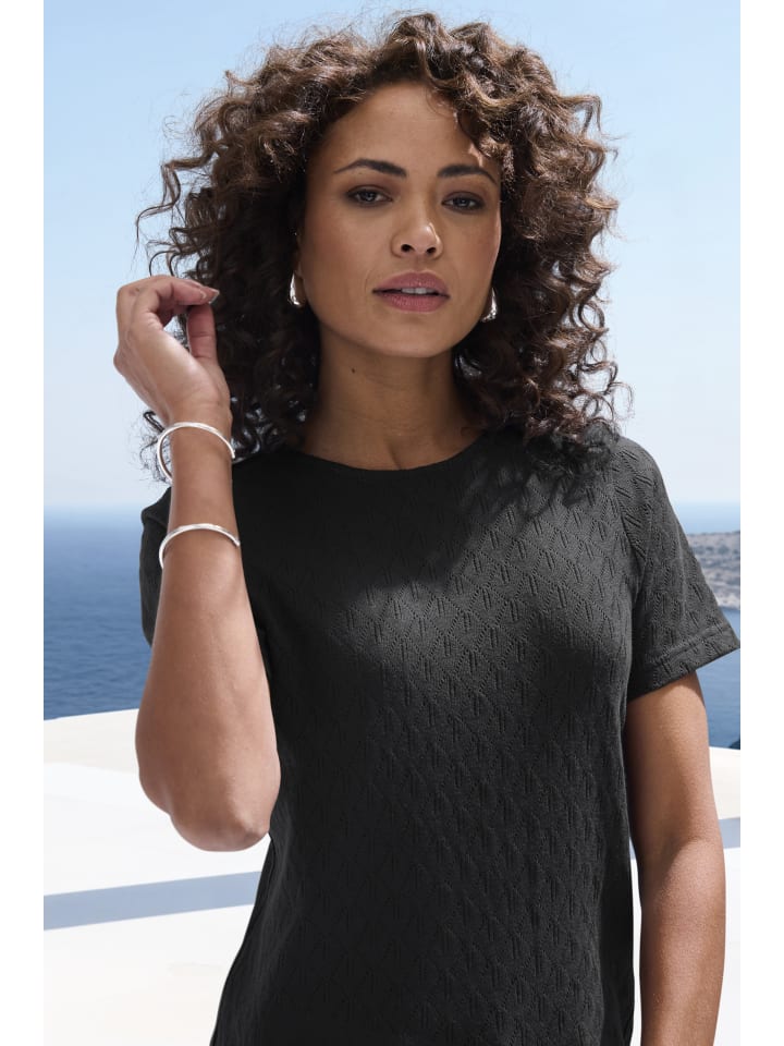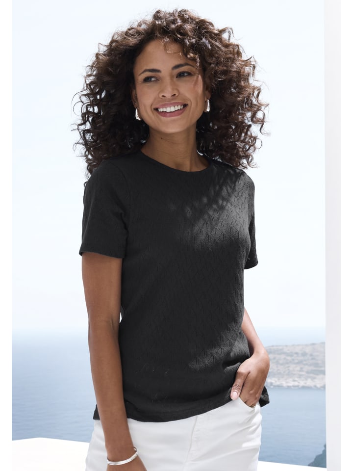 Вязаная рубашка от Vivance. Красивый ажурный узор. Короткие рукава. Круглый вырез. Комфортная посадка. Высококачественная хлопковая смесь.