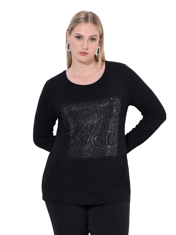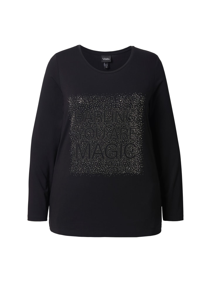 Футболка классического кроя из мягкого трикотажа с надписью из стразов. Круглый вырез, длинные рукава.