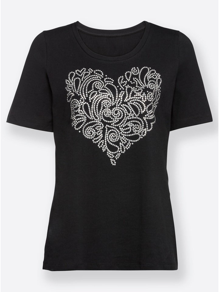 Просто великолепно! Рубашка с эффектным сердечком из серебристых металлических дисков спереди. Круглый вырез и короткие рукава. Сертифицировано GOTS.