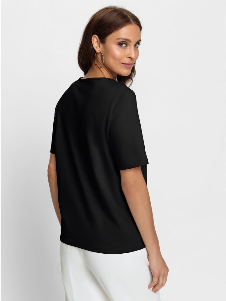 Изюминкой этой рубашки с круглым вырезом являются три привлекательных выреза с декоративными стразами. Исключительно мягкий материал. Сертифицировано OCS.