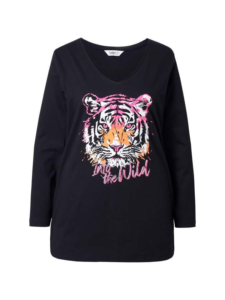 Рубашка с длинными рукавами, удобного кроя, из мягкого трикотажа со стразами на тигровом мотиве. V-образный вырез с необработанными краями.