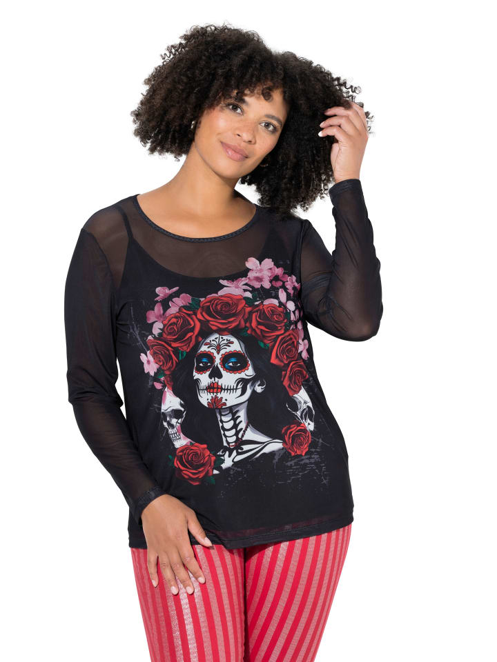 Сетчатая рубашка облегающего кроя из прозрачной сетки с металлическим эффектом и принтом «женщина/череп». Круглый вырез, длинные рукава. Фестончатые края.