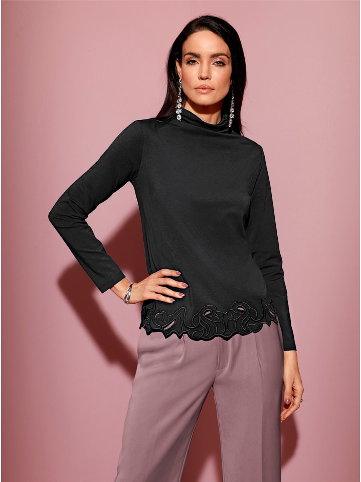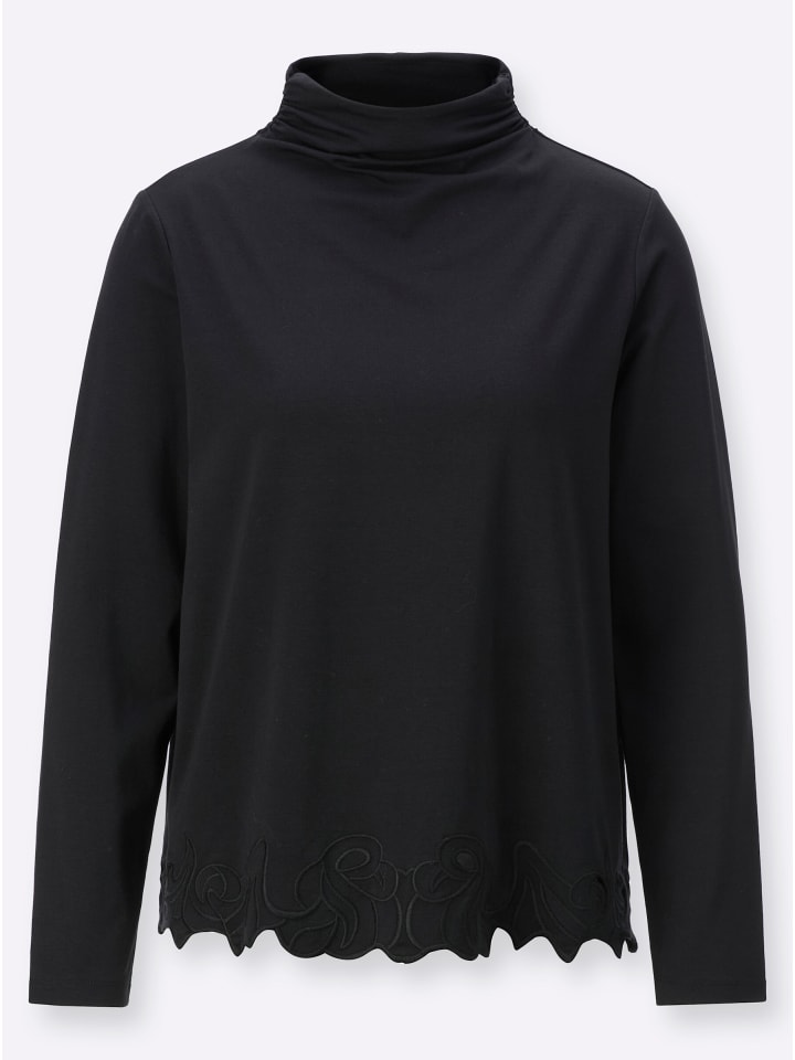 Волнистый подол с вышивкой и вырезами - женственная изюминка этой рубашки из модала и хлопка. А-образный силуэт выгодно подчеркивает фигуру. Удобный воротник-стойка со сборками и длинные рукава.