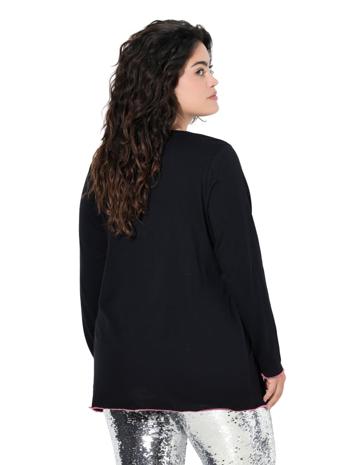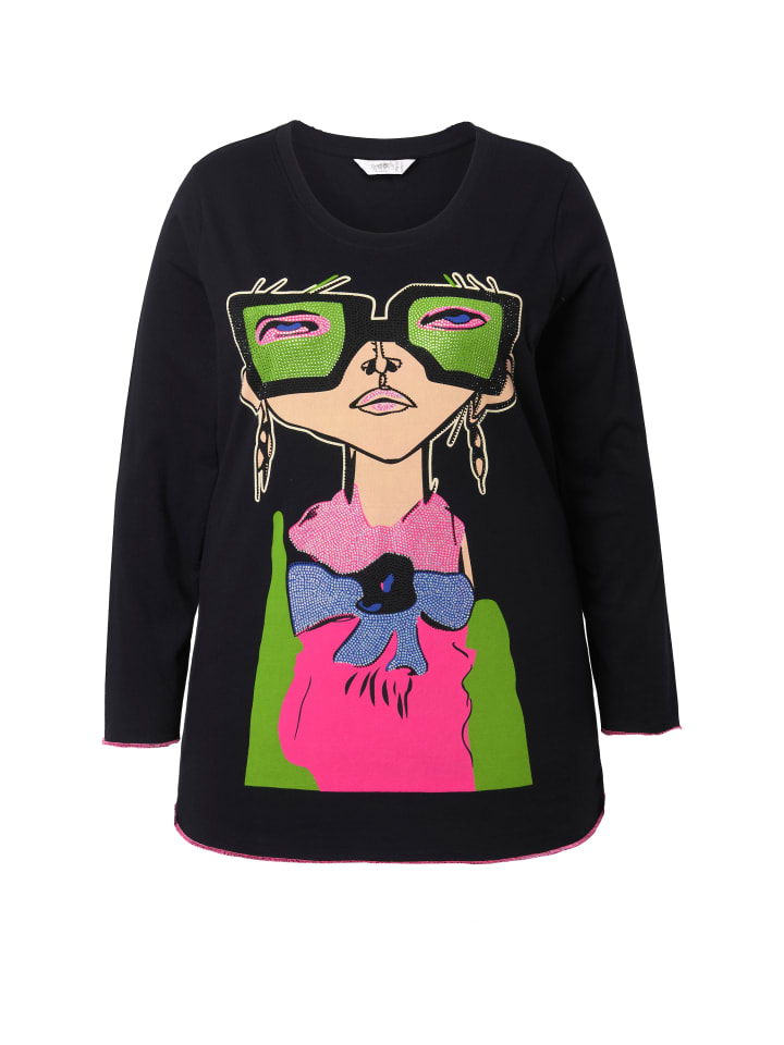 Футболка удобного кроя из мягкого трикотажа с неоновой строчкой. Блестящие камни на женской модели размера XL с солнцезащитными очками. Круглый вырез, длинные рукава.