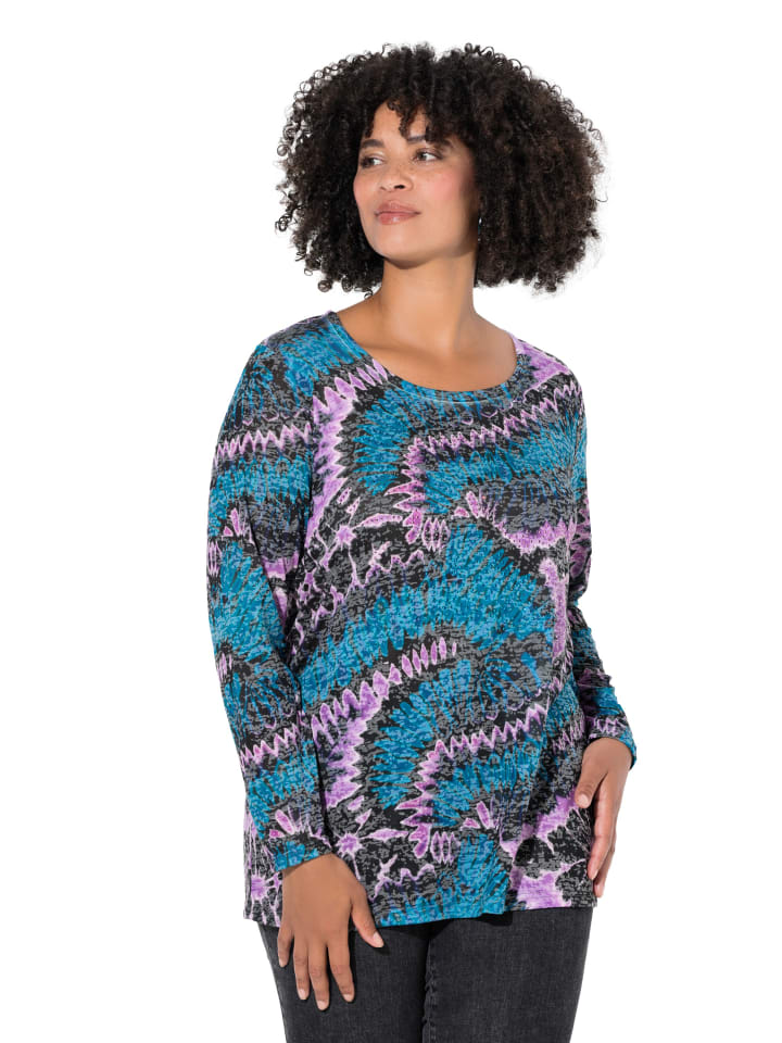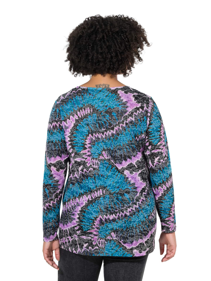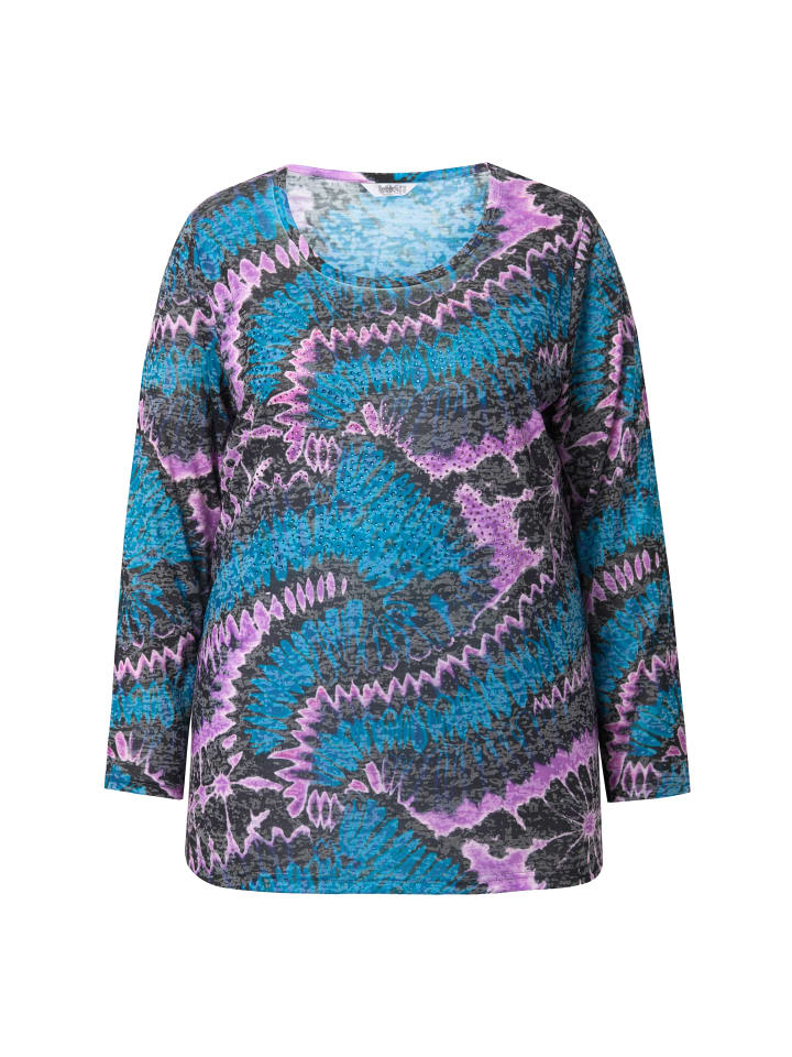 Футболка, удобного кроя, из мягкого выжженного трикотажа со стразами на рисунке батик. Круглый вырез, длинные рукава.