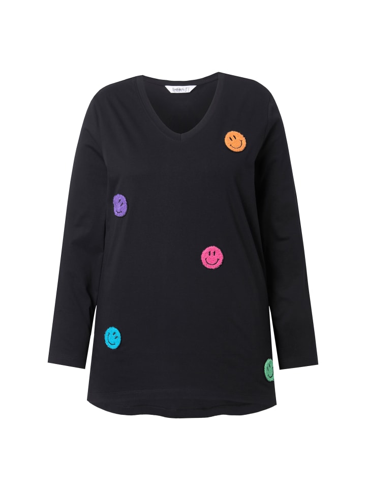 Футболка А-силуэта из мягкого трикотажа с цветными махровыми смайликами. V-образный вырез, длинные рукава, удлиненный подол сзади.