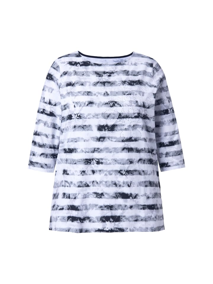 Рубашка А-силуэта из пима-хлопка, выполнена из приятного на ощупь эластичного хлопкового трикотажа с цветочным рисунком в полоску и отделкой стразами. Пима-хлопок: очень мягкий, удобный и высококачественный. Имеет небольшой вырез-лодочку, рукава 3/4 и боковые разрезы для дополнительного комфорта.