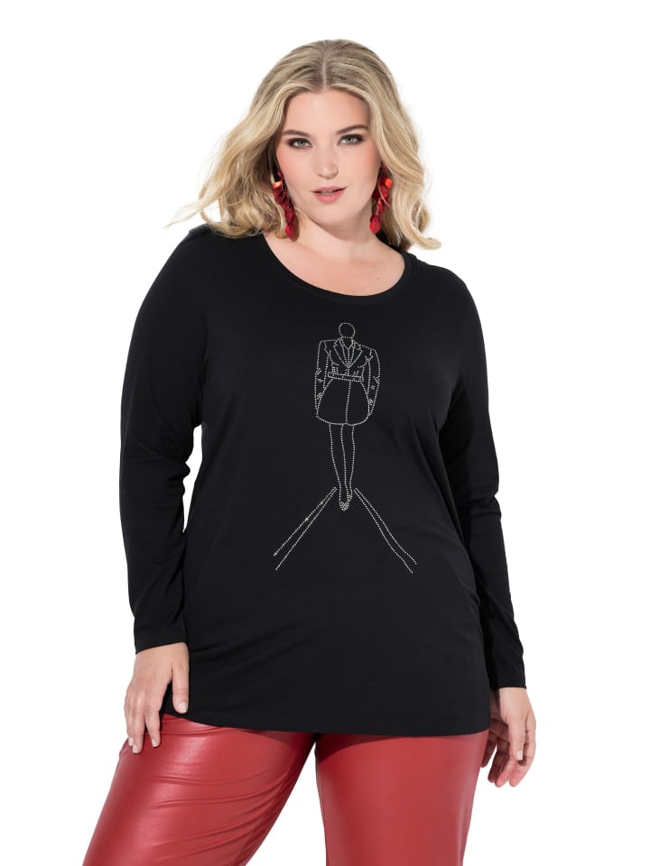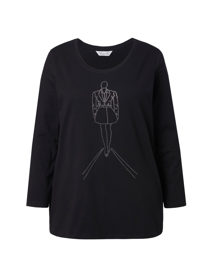 Футболка А-силуэта с рисунком модели, выполненным из стразов. Круглый вырез горловины, длинные рукава.