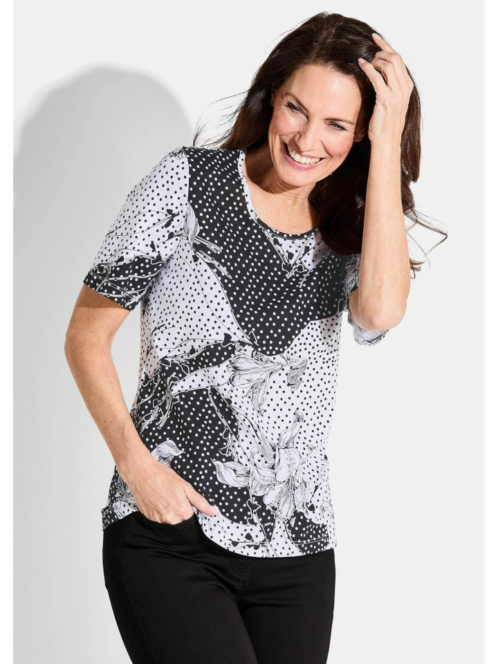 Рубашка с контрастным рисунком в горошек и стилизованные цветы. Воздушная ткань из смеси хлопка и модала приятна к телу благодаря облегающему крою. Прекрасная базовая рубашка с круглым вырезом и короткими рукавами. Длина: около 66 см для размера 46, около 62 см для размера 23.
