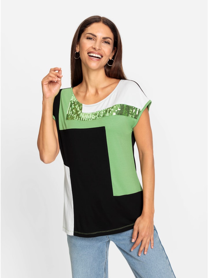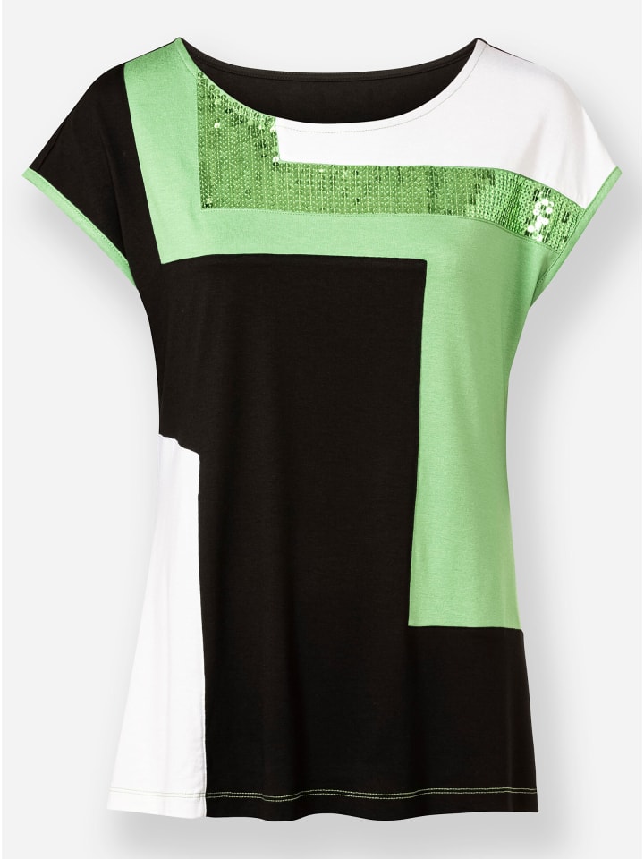 Эта рубашка в стиле пэчворк искусно сочетает в себе эффектный пэчворк-дизайн с элегантно мерцающими пайетками спереди. Она имеет круглый вырез, спущенную линию плеча и контрастную окантовку на манжетах модных коротких рукавов. Изготовлена из приятного трикотажного полотна.