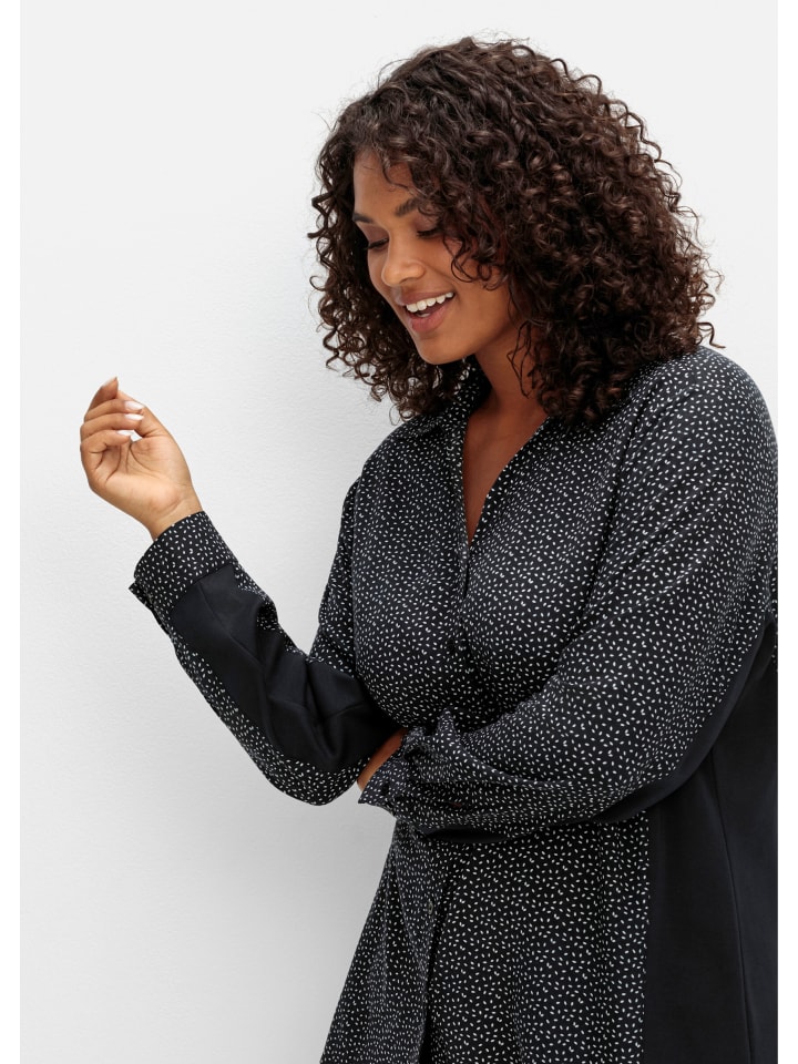 Блузка с сплошным принтом. Однотонные вставки на рукавах и по бокам создают эффектный контраст с нежным минималистичным принтом. В то же время эластичная ткань интерлок обеспечивает дополнительный комфорт и визуально удлиняет фигуру. Блузка с рубашечным воротником и V-образным вырезом, с застежкой на пуговицы по всей длине.