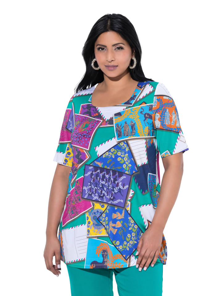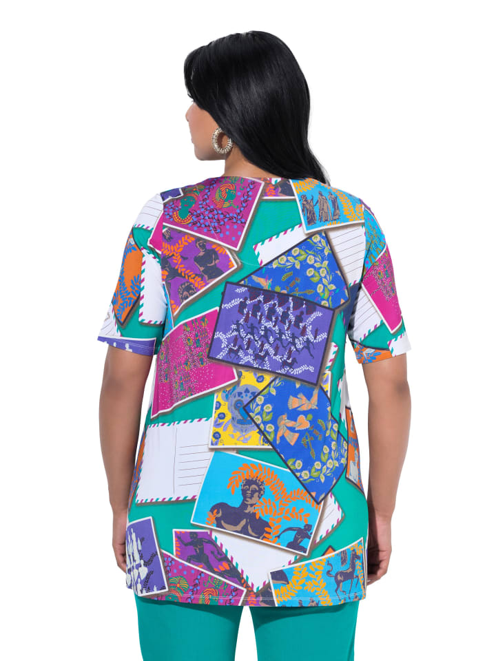 Облегающая рубашка А-силуэта из элегантного облегающего трикотажа с рисунком в виде открытки. Квадратный вырез, короткие рукава.