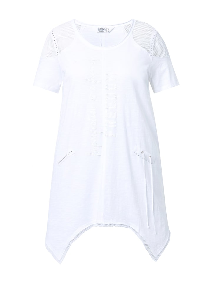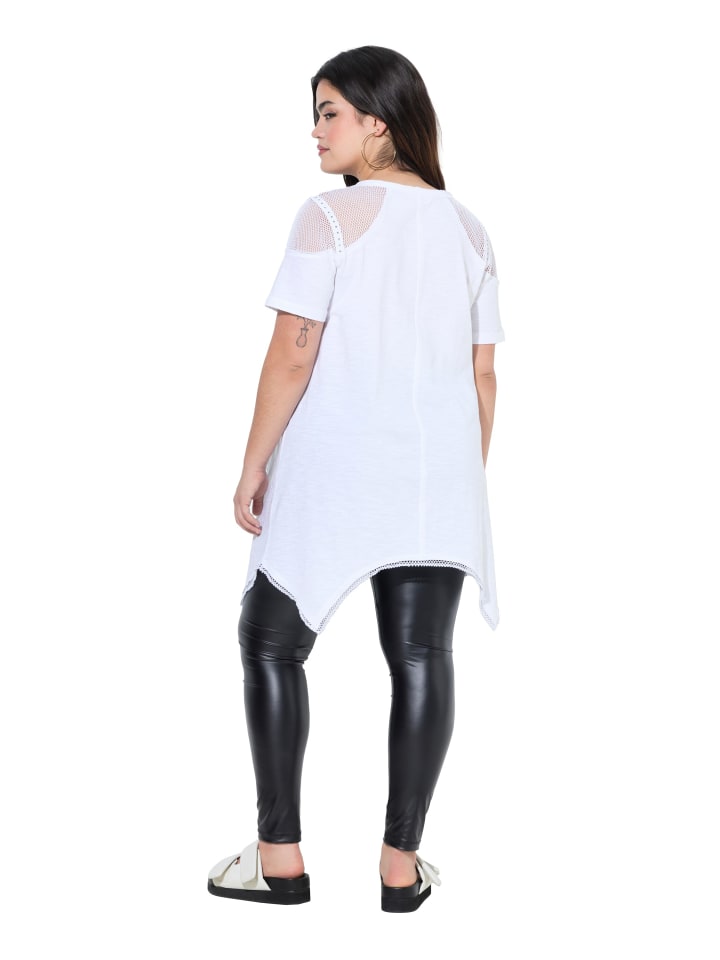 Футболка А-силуэта из мягкого трикотажа с тональной надписью и декоративной строчкой. Круглый вырез горловины с необработанными краями. Короткие рукава, плечи с сетчатой вставкой и декоративной резинкой. Асимметричный подол с кружевной отделкой.