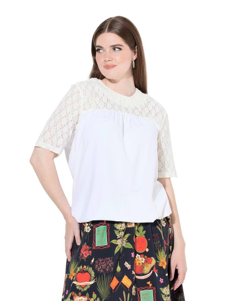 Футболка удобного кроя из мягкого трикотажа. Плечи и рукава отделаны слегка прозрачным кружевом. Воротник-стойка на резинке, эластичный низ - всегда удобно сидит и не сползает.