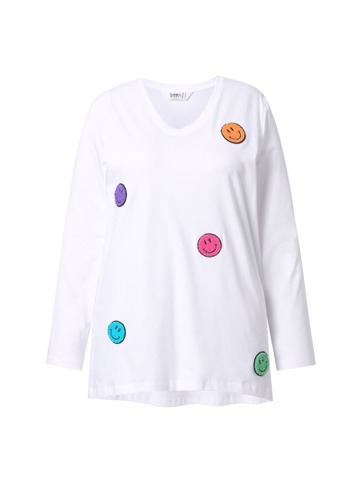 Футболка А-силуэта из мягкого трикотажа с цветными махровыми смайликами. V-образный вырез, длинные рукава, удлиненный подол сзади.