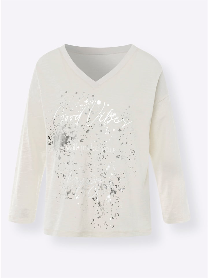 Рубашка с фольгированным принтом, V-образным вырезом и спущенной линией плеча. Рукава 3/4, регулируемые пуговицей. Удлиненная сзади. Сертифицировано OCS.