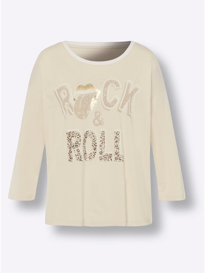 Рубашка с мерцающим фольгированным принтом ROCK AND ROLL спереди, большим круглым вырезом и рукавами 3/4. Сертифицировано OCS.