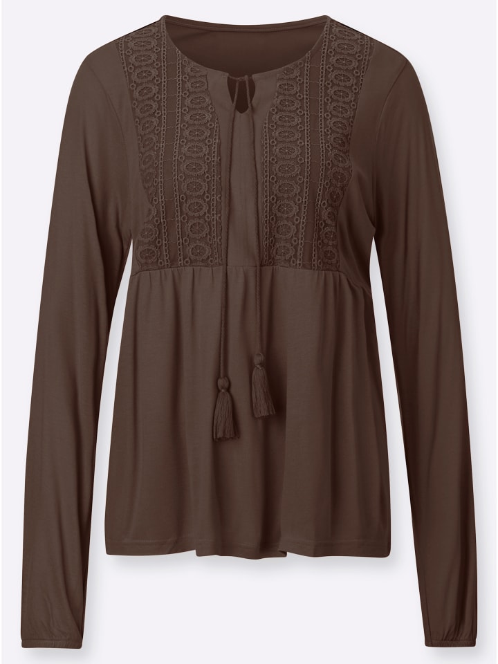 Эта туника мягкого струящегося силуэта украшена декоративной кружевной отделкой спереди. Круглый вырез с небольшим V-образным вырезом и завязками с декоративными кисточками. Присборенный перед обеспечивает красивую посадку. Длинные рукава с эластичными манжетами.